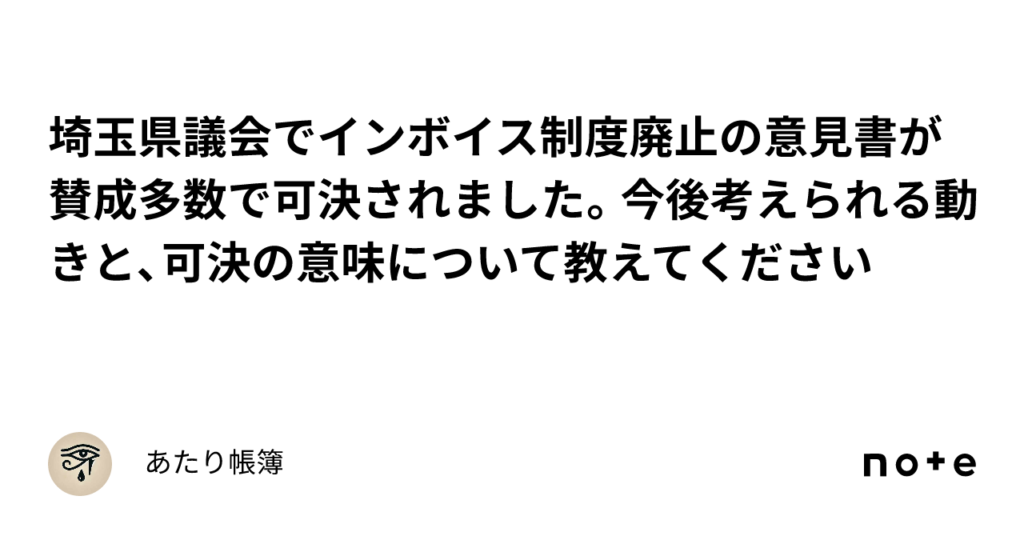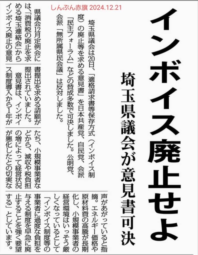 最近、埼玉県議会でインボイス制度の廃止を求める意見書が賛成多数で可決されたという重大なニュースが伝わってきました。
