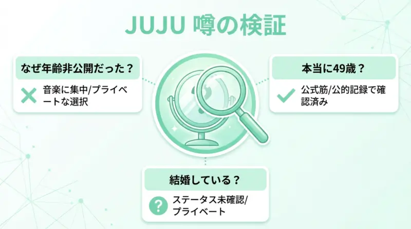 JUJUさんの年齢に関しては、今なお様々な噂が飛び交っています。ここでは、代表的な疑問を徹底的に検証します。
