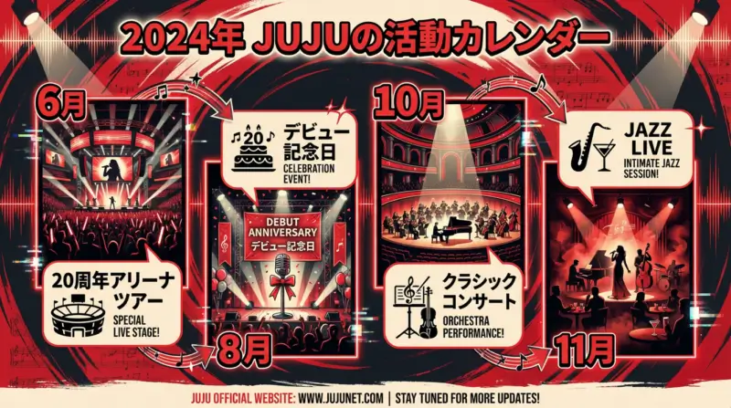 2024年は、JUJUさんにとって記念すべきデビュー20周年の年でした。全国アリーナツアー「JUJU 20th ANNIVERSARY ARENA TOUR 2024 『YOUR REQUEST』」を開催し、デビュー記念日である8月25日にはさいたまスーパーアリーナでファイナル公演を行いました。また、毎年恒例のBLUE NOTE TOKYOでのジャズライブ「JUJU JAZZ LIVE 2024」や、10月10日(ジュジュの日)には「billboard classics JUJU 20TH ANNIVERSARY PREMIUM CLASSIC CONCERT 2024」を開催するなど、精力的に活動を続けています。