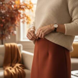 ユニクロの「カシミヤブレンド」のニットと、同系色のニットスカートを組み合わせ、異なる素材のテクスチャーを楽しむことで、シンプルながらも奥行きのある「モード」な着こなしが完成します。