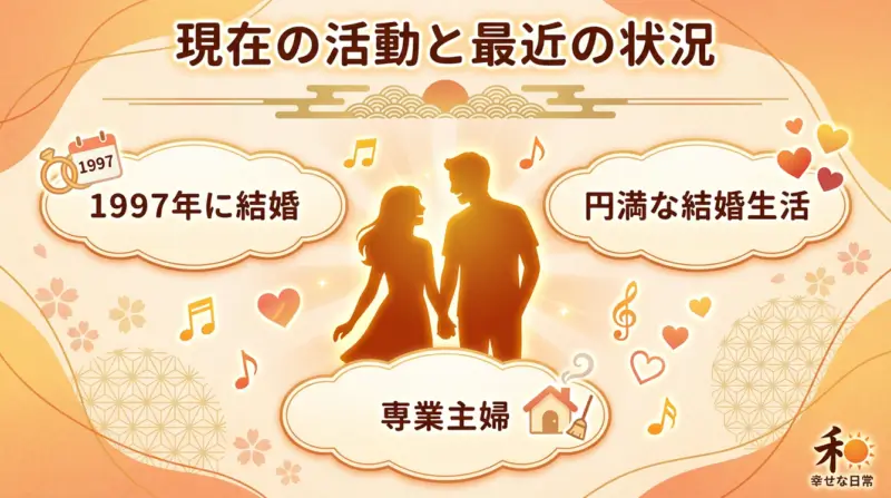 蓬田美奈子さんは1997年に稲葉浩志さんと再婚しました。稲葉さんにとっても再婚であり、二人は静かに愛を育んでいきました。結婚後、美奈子さんは表舞台から完全に姿を消し、芸能活動を引退。現在は専業主婦として、多忙な稲葉さんを支えることに専念しています。夫婦仲は非常に良好で、結婚から25年以上経った現在も、二人で犬の散歩をする姿や、誕生日を祝うデート現場などが時折報じられており、円満な夫婦関係がうかがえます。彼女の現在の生活や、一部でささやかれた噂の真相について深く知りたい方は、こちらの記事が非常に詳しく解説しています。詳細はコチラへ